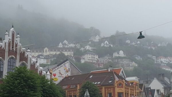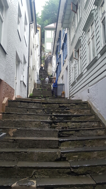 Tourist information suggests path to access the key sights. Bergen is nestled into a valley by a natural harbour, Vagen, surrounded by step mountains. Houses are terraced into the sides – you’d need to be a mountain goat to live here!