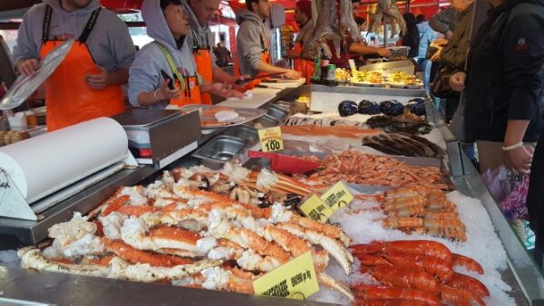 We tram into the heart of Bergen to find the Fisketorget in full swing on the harbour. Part fish market, part short order restaurant, the fishmongers offer seafood platters and fry ups alongside their usual fresh seafood sales. The display is extraordinary, scallops the size of saucers, crabs the size of hubcaps, some with legs that stretch for a metre, lobsters, salmon prepared in a myriad of ways and endless varieties of fish. All pristinely fresh – not a hint of a fishy smell bar the divine scent of shellfish frying. Beside the red tented market, is an up market version, under glass. Very confrontingly, I see whale burgers on the menu. They’re allowed to fish them here, under controlled conditions. Interestingly, some of the crabs and all the scallops are tagged – I can only presume this is for population/catch control.