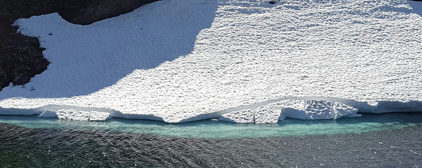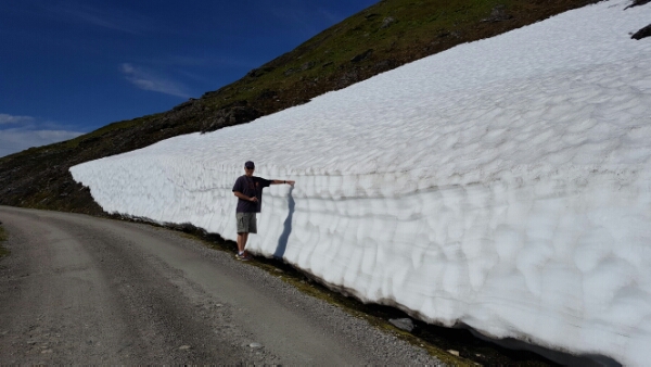 It’s a steep climb that’s rewarded with stunning views and a close up look at the ice drifts. It’s extraordinary to me, that throughout summer’s heat, snow and ice survive, with some drifts taller than Chris. Waterfalls have sprung up, running the ice melt into the fjord below. There’s a revelation too, the ice drifts melt from below, creating archways and gravity defying shapes.