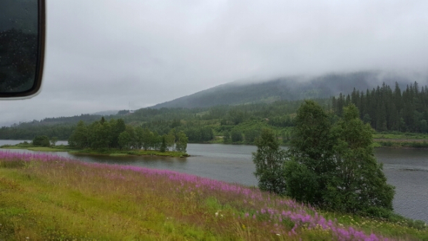The last of the 3% arable farm lands pass us today, we’re soon again in stunning forests, bisected by lakes, streams and the occasional fjord. At one point, we’re driving through clouds, rendering the air thickly soft and damp.