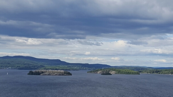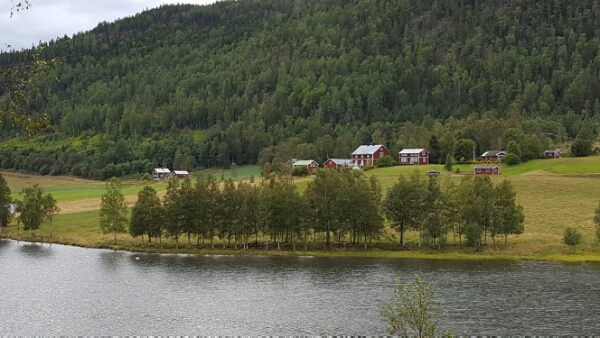 Where it’s not farmland dotted with red cottages, it’s thick forest. Islands, once submerged, now stand alone in the fjord waters. Many are uninhabited, forested right down to the water line, but an occasional house can be seen on some. The village of Nordingra boasts a fine church from 1847 over looking the water, the remnants of a church town to its side.