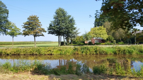The first of the canals appear, signalling our proximity to the Netherlands. With these come the cranes. We have endless sightings of these elegant, tall, grey and white birds today as they sit patiently by the water, long beaks focused, hoping for supper, or take flight across the waterways. No farm kitties on field prowl today, it must not be a work day.