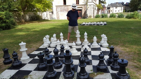 We meet a slinky tabby in our travels, about her catty business, not tame enough to pat, not so so wild that she freaks out. We also see a wonderful network of bunny burrows on a hill. So this is where French bunnies hide. Sanctuary from farmers, on holy land. There’s a giant chess set in one of the gardens and Chris attempts to teach me how to play. Practice needed there…