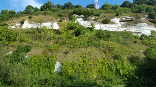 We drive past a wall of limestone cliffs, the partner side to the cliffs we saw the other day. These are so like the white cliffs of Dover that you can literally see how the once joined land mass split in two, creating the English channel.