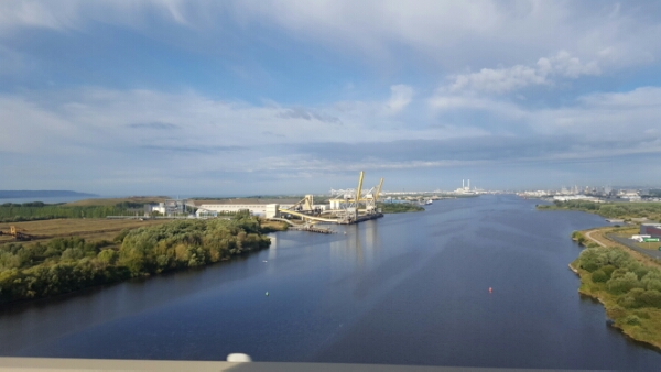 Along the way we cross a very serious bridge, new I think, lifting us over two arches, high over the Seine tributaries that flow into Honfleur and Le Havre. The tide is in, and our height offers a perfect bird’s eye view of the blue waters below.
