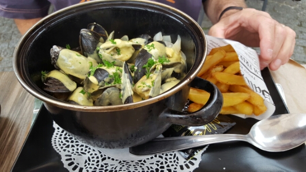 Treats secured, our minds turn to lunch. We settle in one of the tiny cobblestoned squares for cafe treats: curry moule and frites for Chris, a gallette for me. Both are exceptionally good. A half litre of chardonnay eases us into the late afternoon. I’ve decided that a half litre is the perfect amount of wine at lunch. A glass doesn’t quite hit the spot, a bottle can be a little too snoozy. The half litre gets the Goldilocks tick of approval: just right.