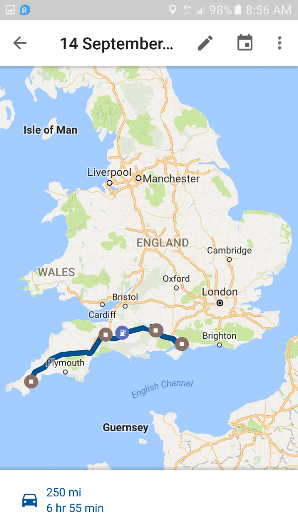 This is where it gets off the rails. I presume that we’re stopping somewhere nearby, breaking the long trip across the bottom of England, but a cursory glance at TomTom reveals an extraordinary distance left on our journey. Awkward conversation follows: Chris claims lengthy conversation about this journey, I claim no knowledge of agreeing to an epic journey. Hmmm. 6hrs 55 minutes.