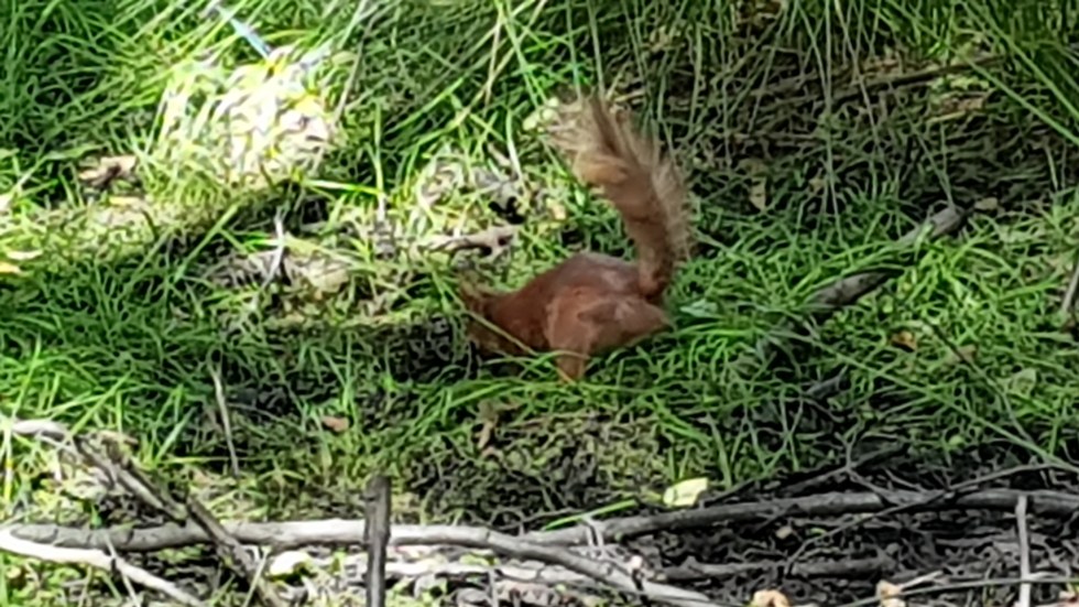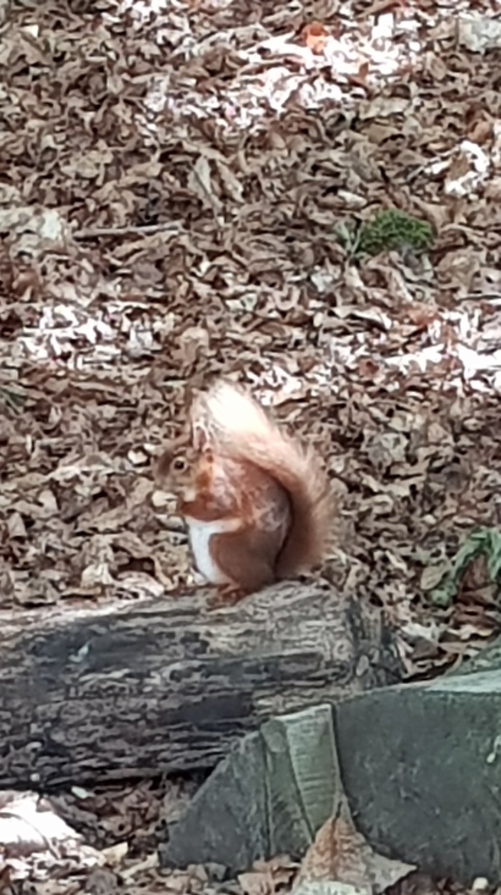 Further down the boardwalk, there’s a flash of red, then another! Two red squirrels, in full chase, not giving a moment’s thought as to who’s around, making baby squirrels in mind I suspect. Very promising… we’ve hit the jackpot in this spot. Another flash of red darts by. 3!