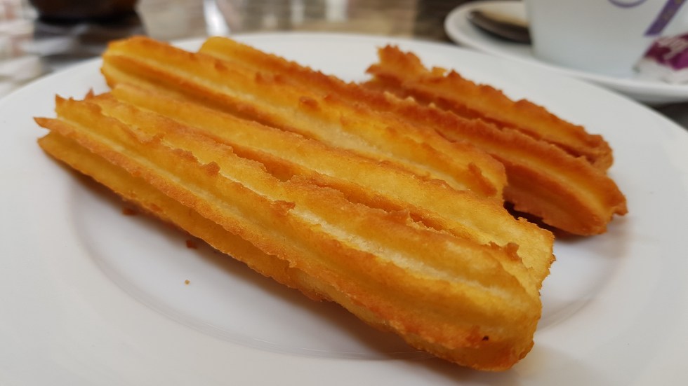 The city is reawakening after the afternoon close, we wander around a little more and then settle for a drink. I succumb to churros and chocolate, Chris a beer. We’re in the square in front of the cathedral beside a fountain, which despite the surrounding bustle, is a peaceful spot. A well earned rest after hours of walking.