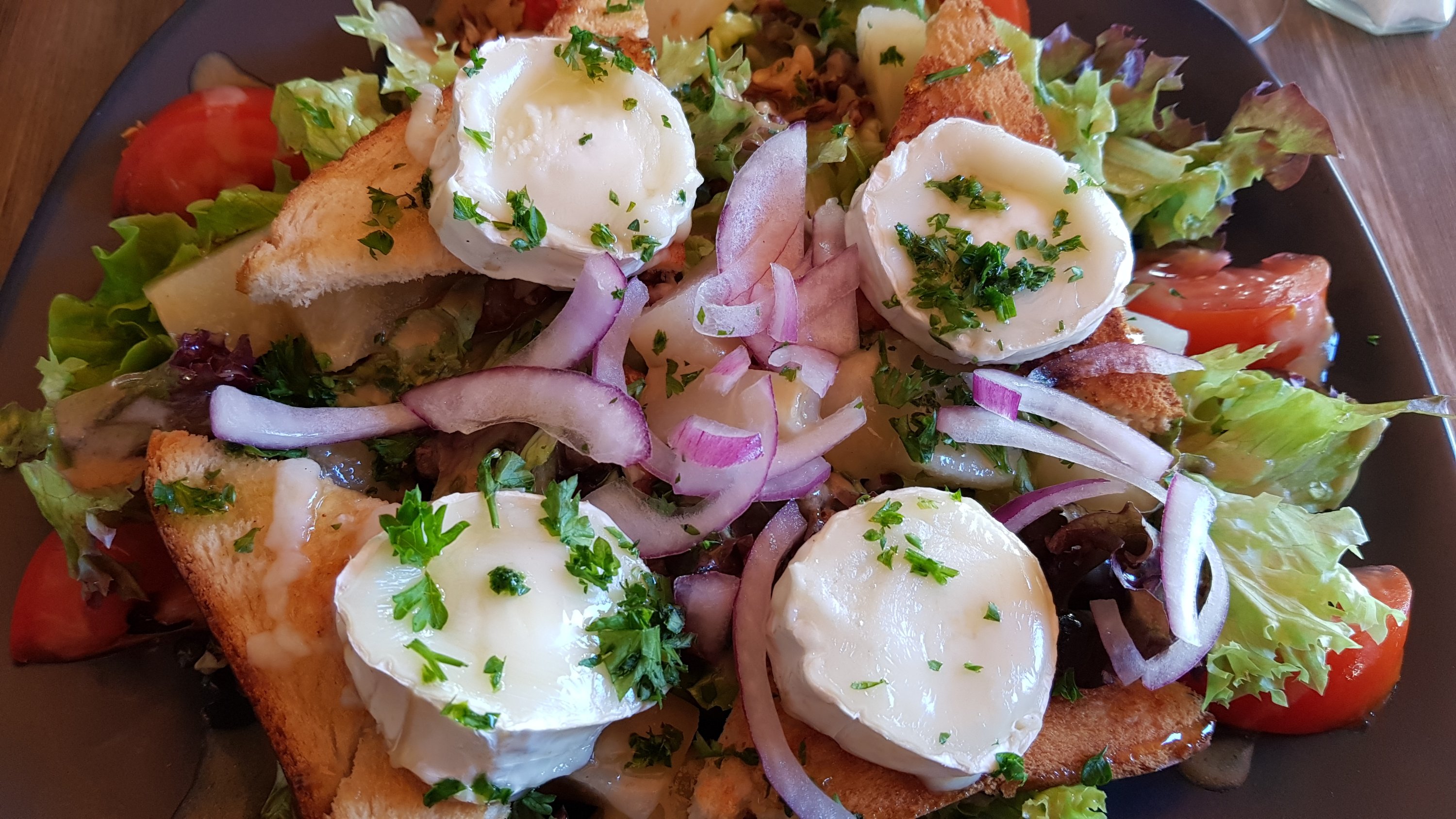 Chris opts for curry moules and frites, a surprisingly good flavour combination but I’m lured away from the gallettes by a gloriously good, honey dressed warm chevre salad.
