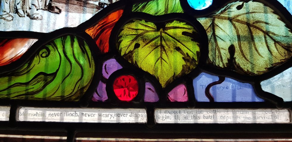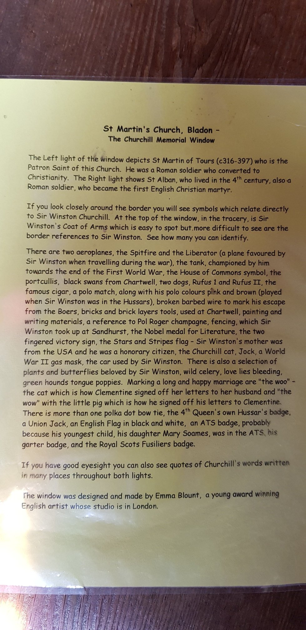 A stained glass window was erected to commemorate the 50th anniversary of Churchill’s passing. It’s magnificent, detailing many things from his life in the design, including his military career and family crest as well as his favourites – his whiskey, art, bow ties and pets.