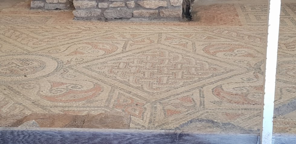 Also a feature is an almost intact mosaic floor, intricate in its design. It’s in a locked room as the site is unattended today but we can still still see it through the glass.