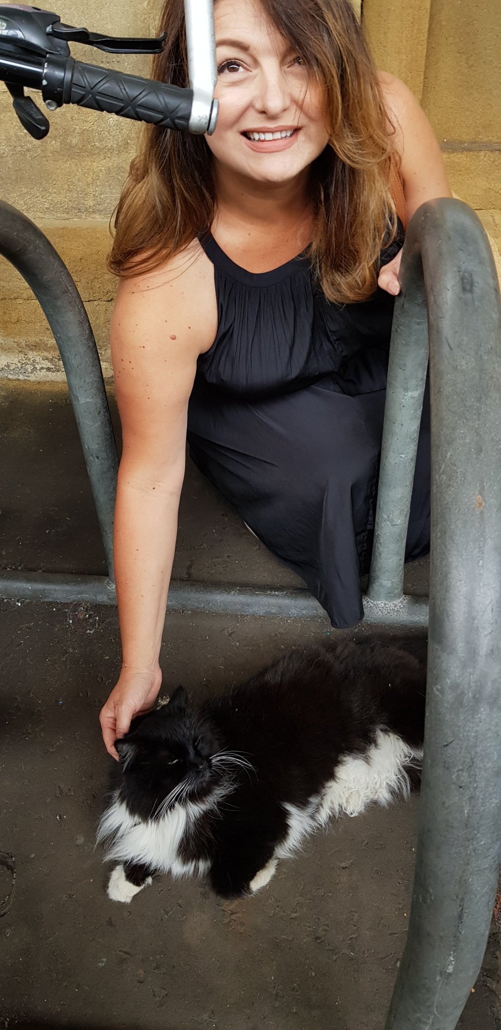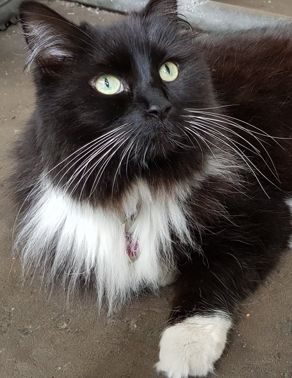 She’s a floof, but not excessively so. What Americans would call a tuxedo cat. Her gloriously fluffy tail has a jaunty white tip. Her eyes are a sharp clear green. She’s a very, very, very pretty girl.