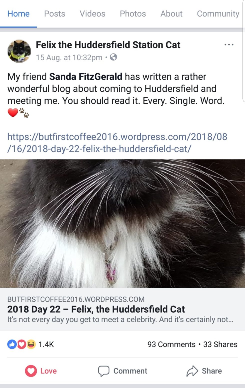The last 24 hours has been rather wonderful. Blissed out at meeting the gorgeous Miss Felix, the Huddersfield Station cat, I shared my blog post about it with her* in a private message, thinking she might like to know how happy she made me. (*Now, I do know that there is a lovely human who manages Felix’s Facebook page…but just let me have my little fantasy where I had an exchange with Miss Floof herself, as I tell this story.)