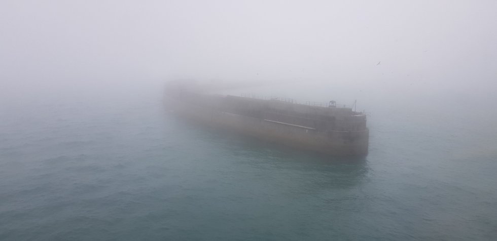 Despite the warm conditions Dover is in mist, its famous white cliffs barely visible.