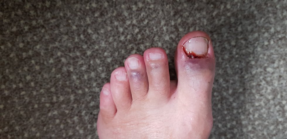 So. A small misstep by himself last night has changed our plans a little. Confident in his indestructiblity, he decided to walk down an embankment. A 40 degree grassed embankment. At night. In the wet. Of course he fell, and almost knock three toes off in the process. I’m debating what might have hurt more: the toes, or having to fess up to it. The latter, I suspect, despite this: