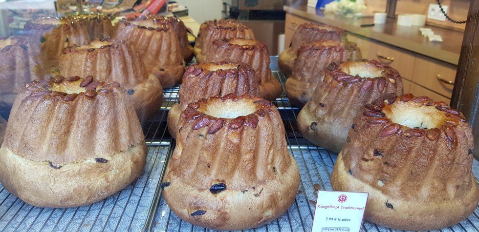 Eguisheim is very well aware of its appeal – it’s well serviced by hotels and restaurants, many of which offer regional specialities. The flammenkuchen features heavily, and its onion, bacon and cream scent carries happily in the air. Also a speciality here is the kugelhoph, a yeasted enriched dough baked into a domed babka tin. These were further enriched with dried fruit. Their buttery scent was quite enough to drive you mad. Even through the glass…