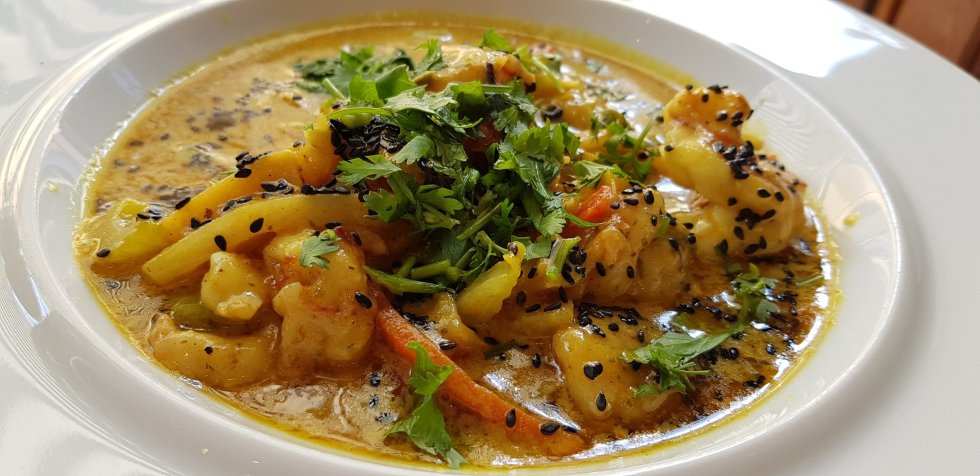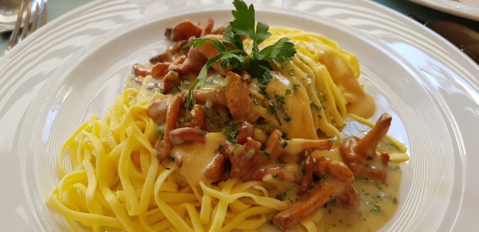 We settle for lunch: chanterelles in a light cream sauce on home made pasta for me, and a excellent yellow curry with prawns and scampi for Chris. A crisp rose rounds lunch out nicely.