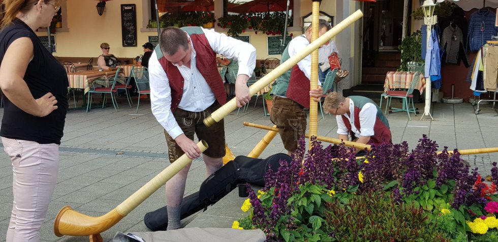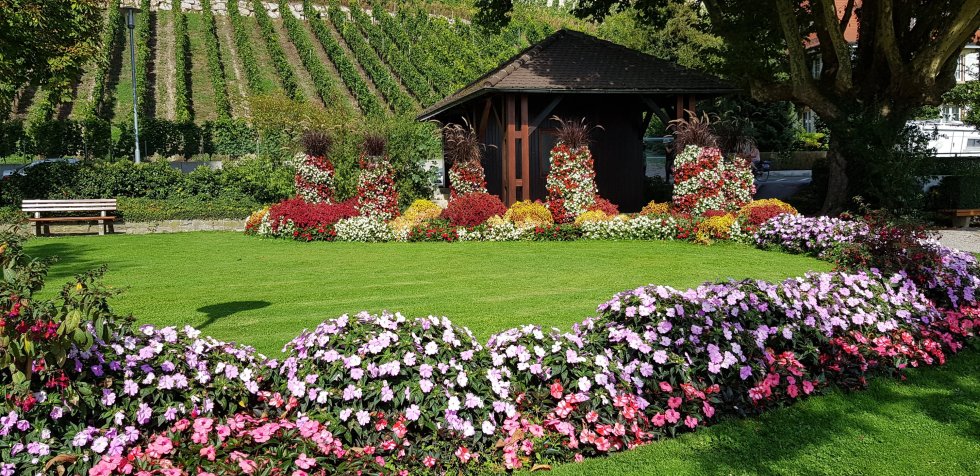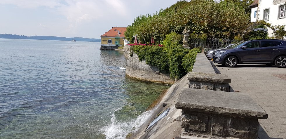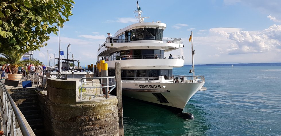 The weather is perfect – rain was forecast, but it’s been banished to the evening. Lake Constance is stunning under perfectly blue skies for the crossing. We get a great view of Constanz harbour on the way out, framed in blues above and below.