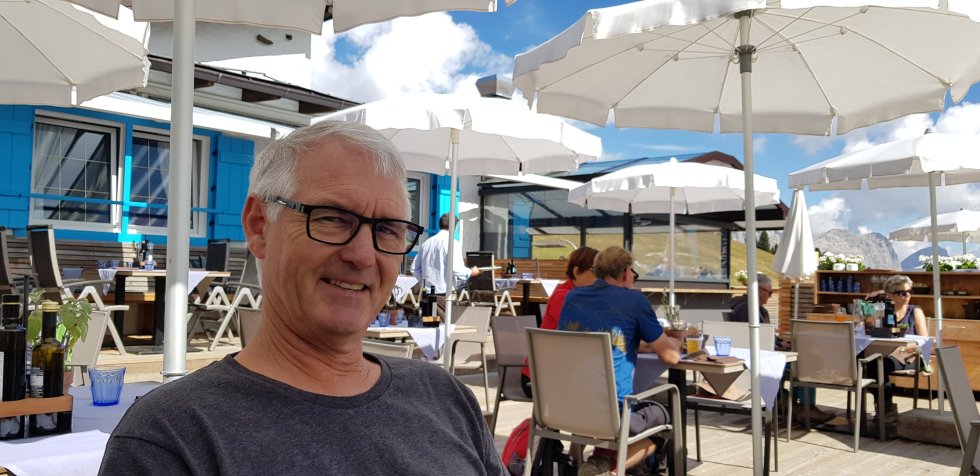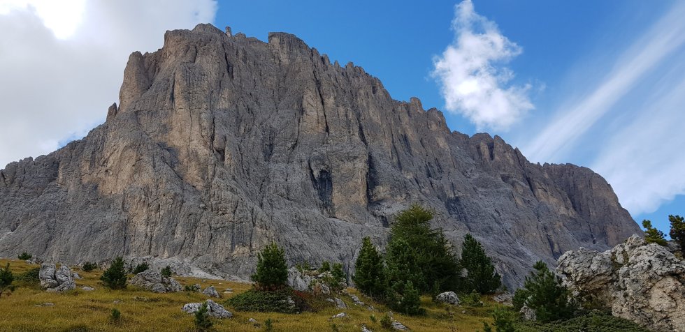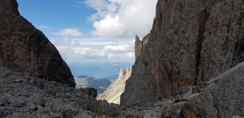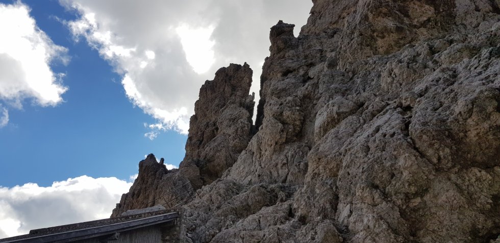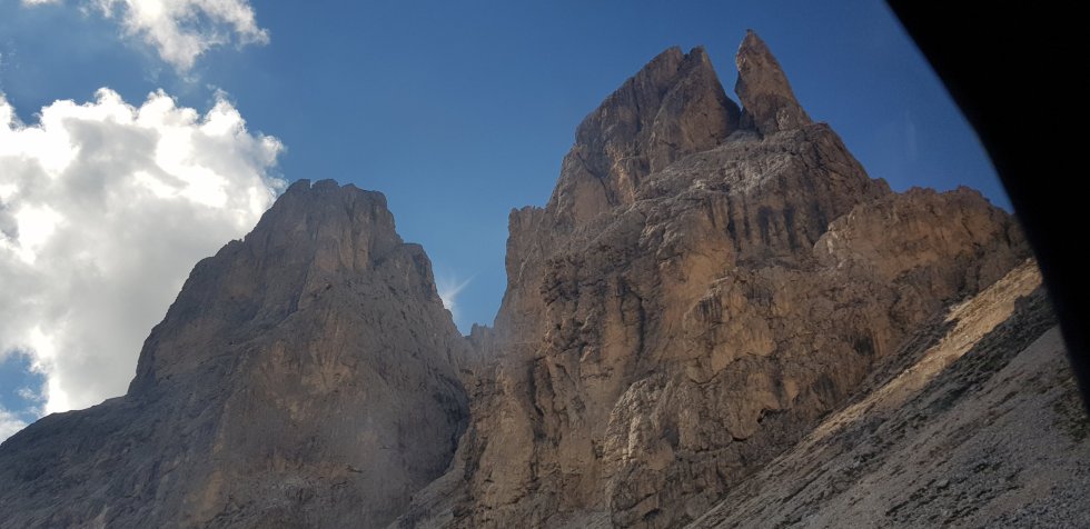 To add to the drama, there’s no platform. And it doesn’t slow down. You stand in a spot and take a running leap to get on. The second person stands a little further on and leaps in after you, then they slam the door shut. Now in my defence, if there had been a few people ahead of us, I might have worked it out. But there weren’t, so I didn’t know I was meant to jump. That extra bit of a second’s delay meant I was late, but got on. Poor Chris then had to run and make a flying leap, with fully laden backpack, before the car left. That sound you can hear is my heartbeat pounding in my ears, partly compounded by the terror of what acrobatic move we might need to execute to get off at the third peak: Forcella Sassolungo.