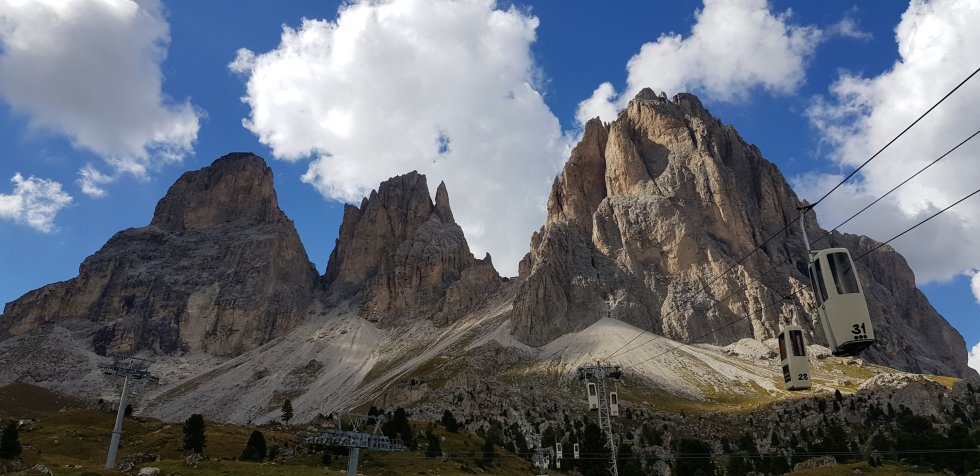The first cable car is easy enough. It takes us to the peak of Piz Sefeur. Even at this level, the Dolomites are breathtaking. We’re surrounded by mountains on all sides, snow capped on the far eastern peaks, jagged rock on ours.