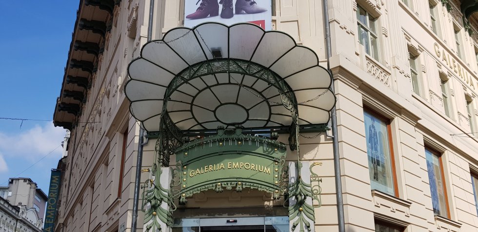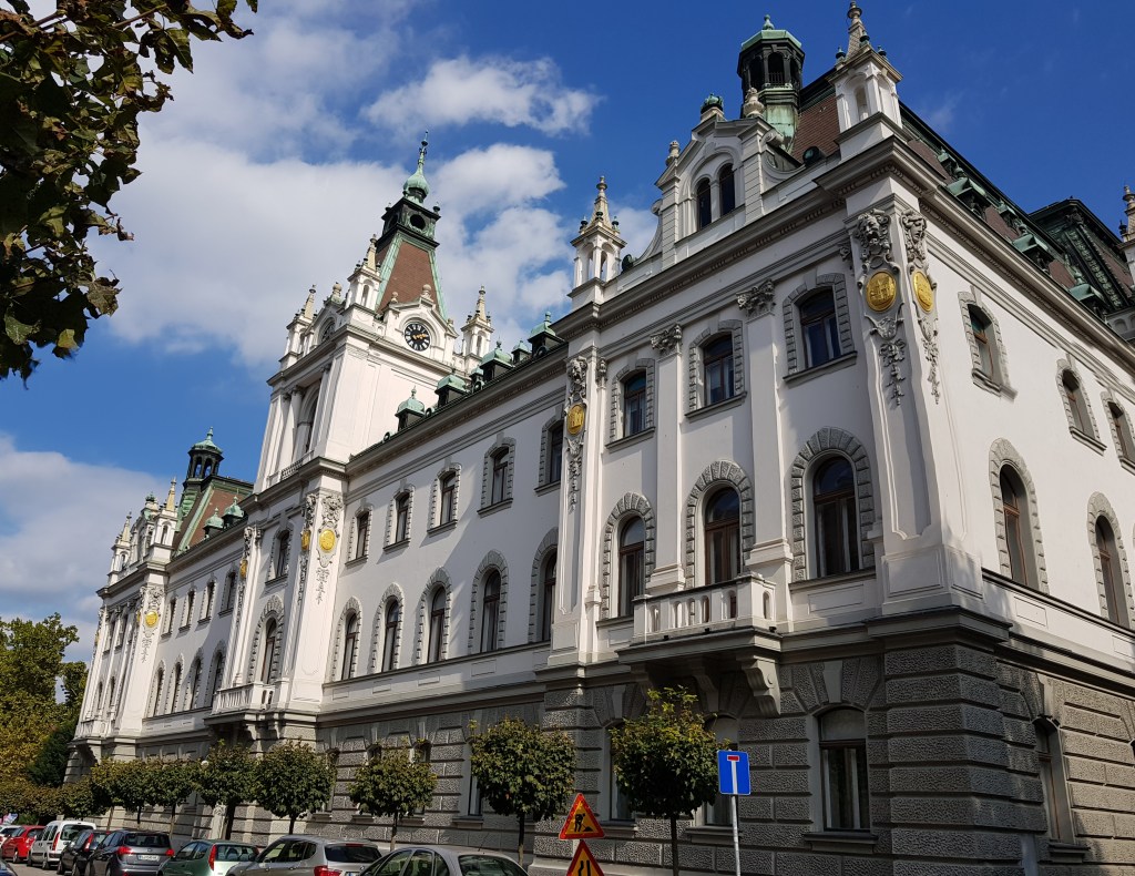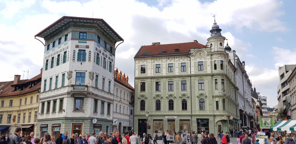 It takes us a while to locate Ljubljana’s most colourful building, the Cooperative Bank, designed to reflect the colour and form of weaving the region is famous for.
