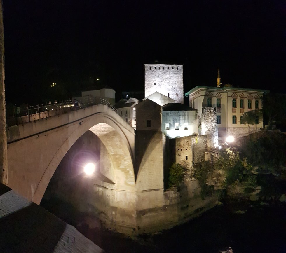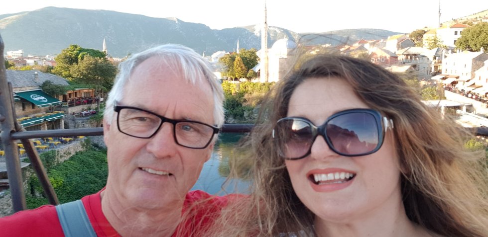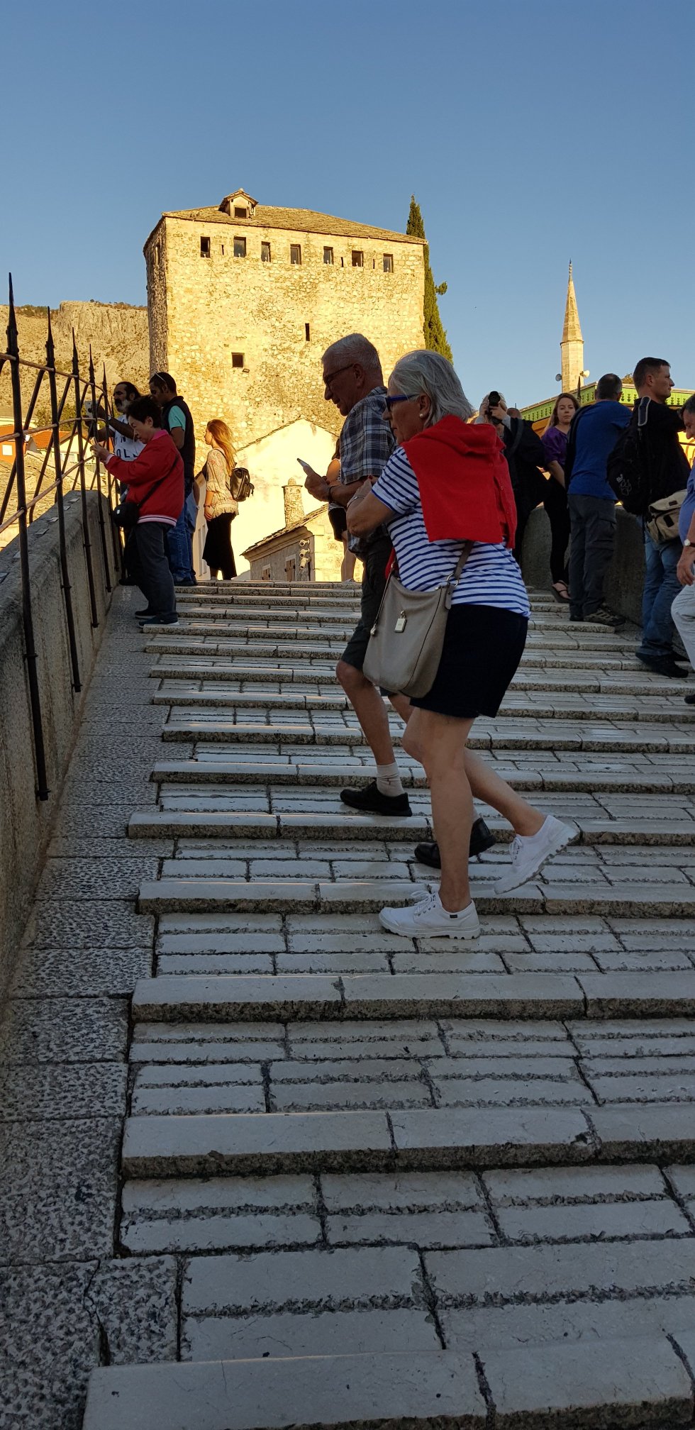 The old bridge, Stari Most, now protected under UNESCO order, has been faithfully rebuilt. Despite being recognised as one of the most important pieces of architecture of the Ottoman period, it was bombed in the 1990s war. Its peak can be reached via a marble arch, it too, worn smooth. Every woman and I cling on and climb. And stupidly I wore slippery shoes! That’s us at the top. I’m looking particularly pleased that I haven’t managed to break an ankle. 😂