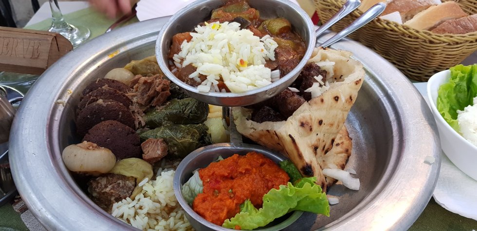 Eventually Chris convinces me it’s time for dinner. We sit outside – it’s such a balmy night – an order a classic Bosnian platter for two. It’s delicious, full of favourites, stuffed vegetables, dolmades, chevaps in pita with sweet white onion and accompaniments.