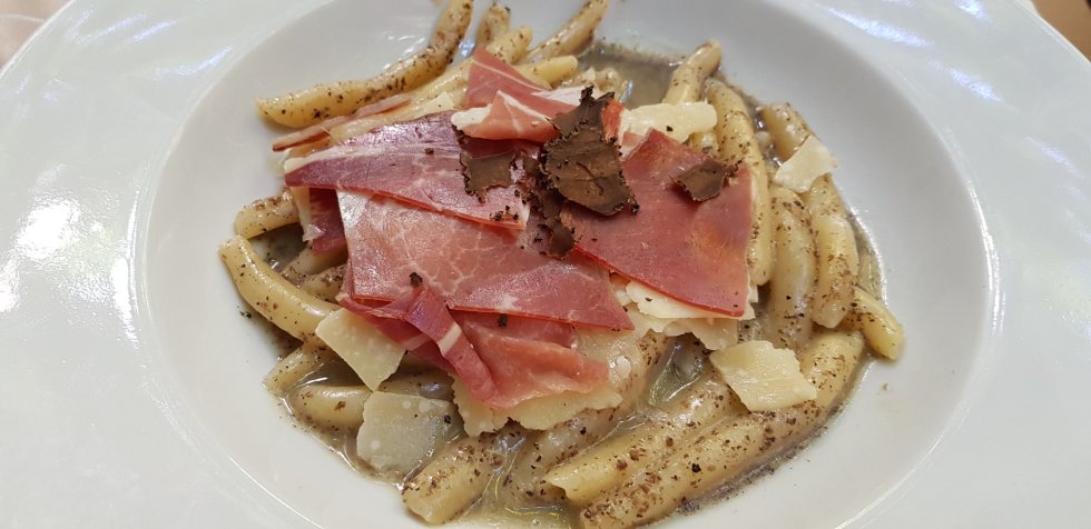 We find the restaurant our friend recommended and settle in for an excellent lunch: hand made rolled pasta with truffle and Prosut for me,