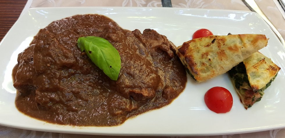 a traditional Pasticada with a chard roulade for Chris – I’ll let Wikipedia explain “It requires long and meticulous preparation: first, the meat is pierced and stuffed with garlic, cloves, carrot and bacon, then salted and marinated in vinegar overnight. The marinated lamb is then roasted and cooked with roasted bacon, onions, parsley root, nutmeg, prunes, tomato paste, water and prošek (a sweet dessert wine) for up to five hours“.