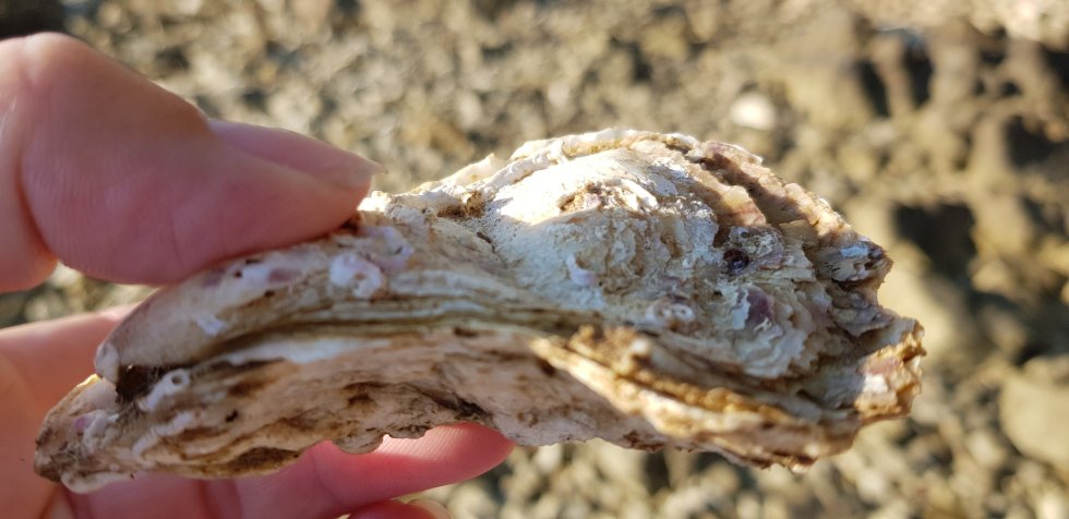 Incredibly, my first find is an enormous oyster washed on to the shore (back he goes),