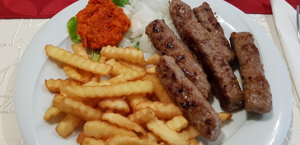 The weather, finally, is a little unkind. By the time we arrive and have lunch, the heavens open. It had to be chevapchichi, right, our last lunch here? Naughty chips work well for the cold weather! Chips have crept in via tourism, I suspect. I’d much rather have the classic cabbage salad with them.