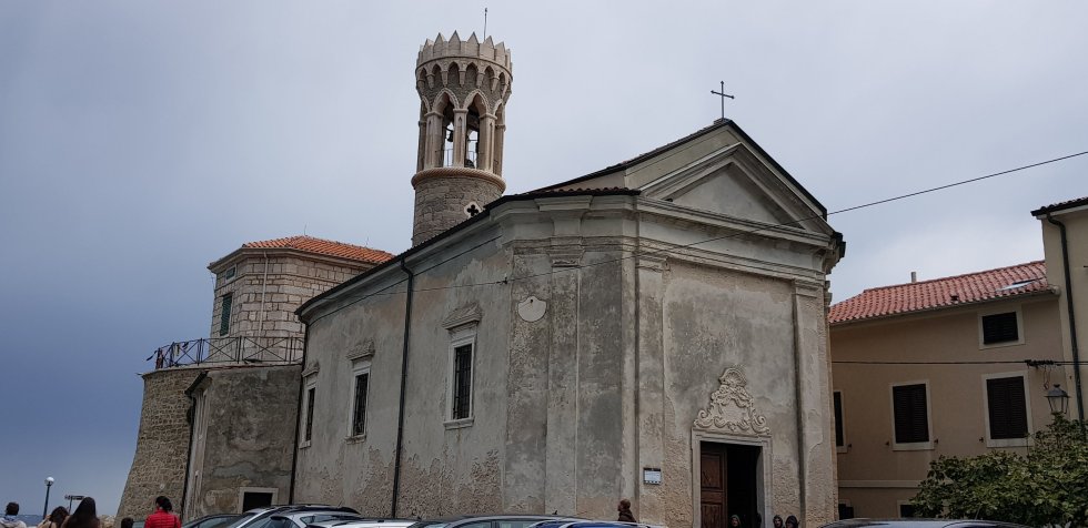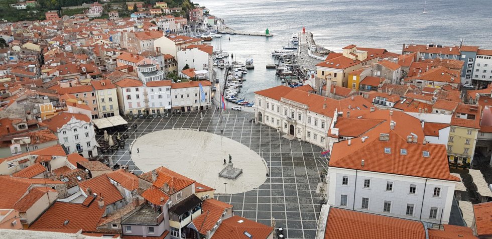 We climb up to the highest point, St George’s Cathedral and shimmy up its bell tower. From here, there’s a perfect view of Tartinijev Trg, the main square, but the winds are utterly ferocious and bitterly cold on high.