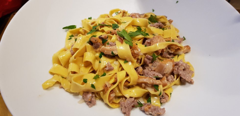 Chris has a tagliatelle with sausage and chanterelles.
