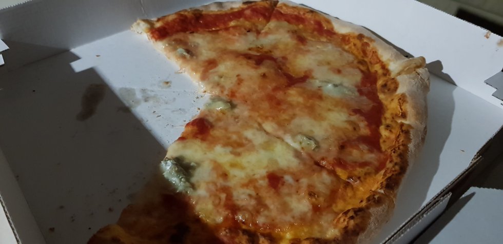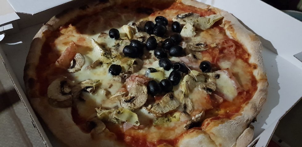 It’s swollen up rather horribly. Himself takes himself off to capture dinner. Italy calls for pizza and it’s excellent – thin dough, simple toppings. Gorgonzola on one, prosciutto cotto, artichokes, olives and mushrooms the other. Yum!
