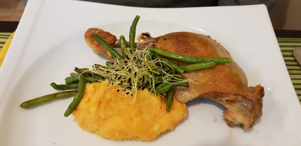 It’s lunch first, of course, duck confit for Himself,