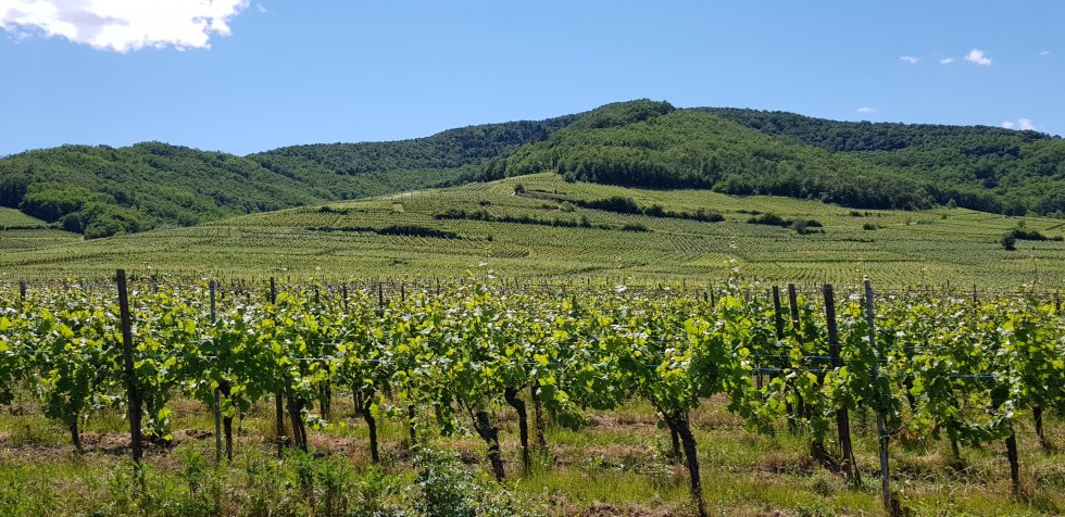 The day is glorious, sunny and blue skied. We finally pass out of farmland into the Alscace hills, very close to the Swiss and Germany borders. Their influence on buildings is clear. Wooden second stories are common, decorated with prettily flowered window boxes. We go from open plains to hills, and the first of the vineyards appear.