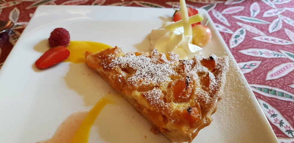 Both very good choices from an exceedingly busy family run restaurant. It would have been rude not to have dessert – a very fine apricot tart to share.