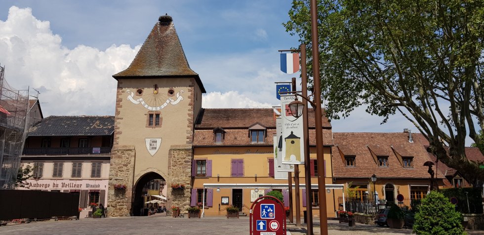 Our tourist discovery trail is led by a cheerful dragon, but I can’t discern why – there’s no legend behind it, teasing that he might have once existed. The village is guarded by a magnificent entrance: the Porte de France, on top of which is perched a stork’s nest filled to the brim with spring hatchlings.