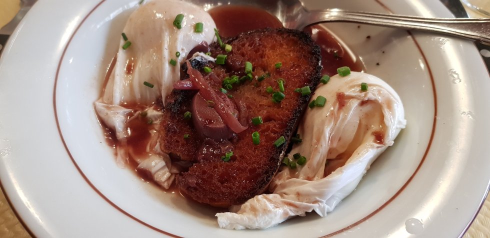 I have eggs poached in red wine with mushrooms. For mains, beef provencal (served on a surprising bed of noodles). I have the roasted jambon.