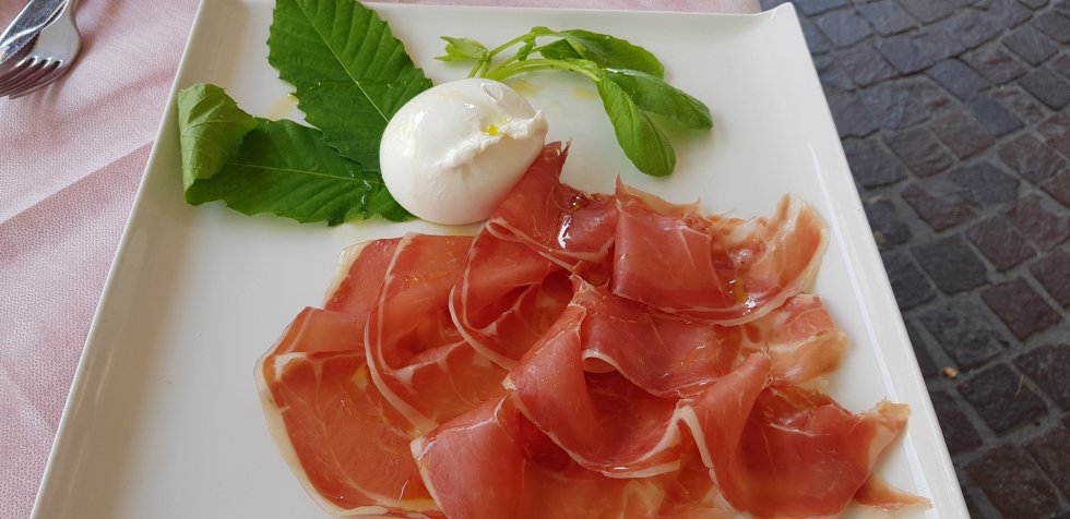 Himself has selected the nearby Aquila Nera Ristorante. It’s a good choice for self medicating with a little of the region’s finest. We share a local DOP San Daniele prosciutto with a fine burrata. If there was ever a gift from the white cheese gods, burrata is surely up there. Its creamy texture is the perfect counter to the salty, melt in your mouth, prosciutto.
