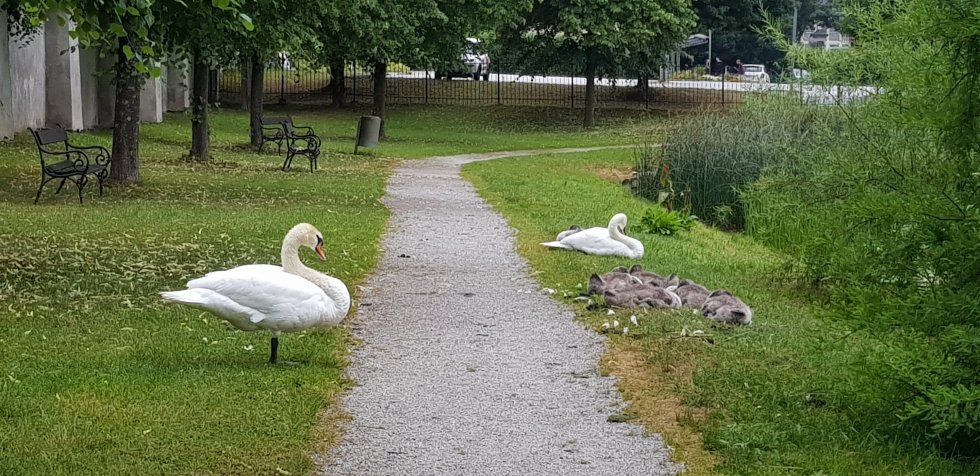 For tonight, I’ll settle for a walk around the Abbey’s grounds and lake, where we meet a pair of swans with 5 fluffy cygnets and many ducks going about their evening chores with a sense of some importance.