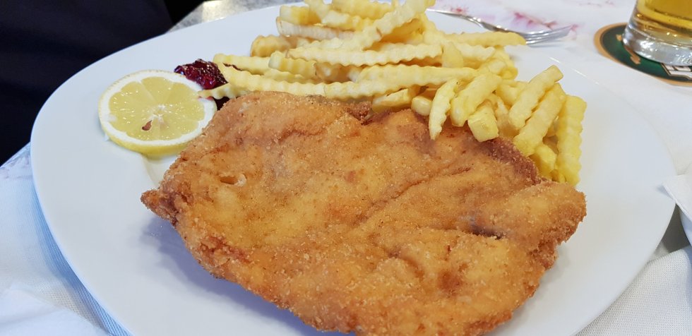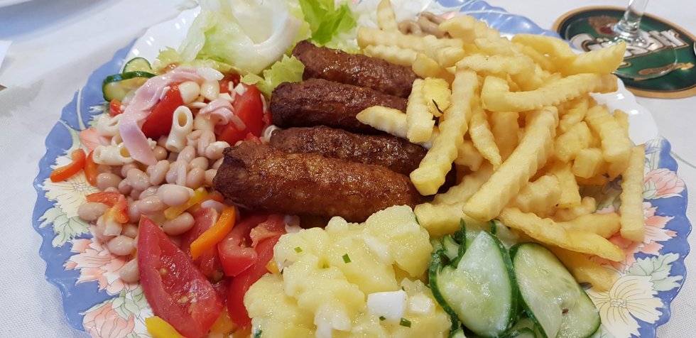 After a very full morning, Himself has worked up a fine appetite. Just as well – the meals here are huge! Chris’s plate is barely visible under his schnitzel, as is mine – chevapchi (at last!), equally generously garnished with many salads. We just won’t mention all those chips…
