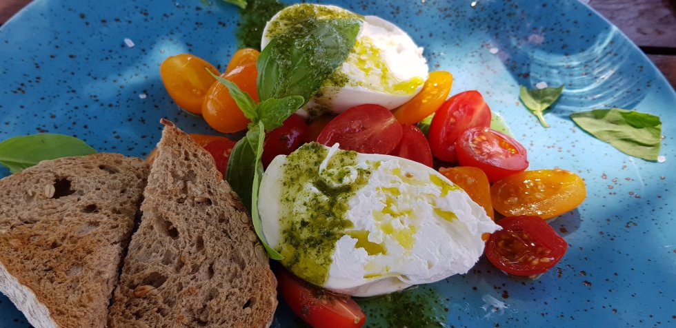 I swear the man has hollow legs. I’m much happier with my burrata and tomato salad, deliciously dressed with a fragrant pesto.