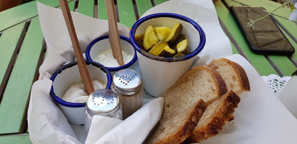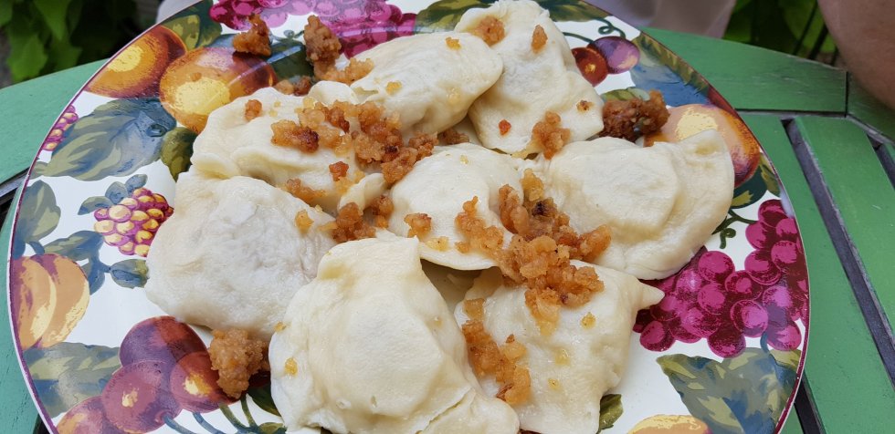 Eventually, Himself’s tummy gets the better off him. “Lunch” he says, and having caught my pierogi bug, proceeds to order same. There’s pickles, herbed cottage cheese and of all things, lard with scratchings, to start: they have big appetites here. That’s just the “welcome” snack.
