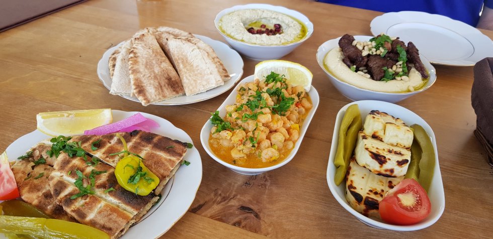 before Himself executes the remainder of his plan: lunch then a river cruise. He locates a restaurant he fancies which ends up being a Lebanese feast: haloumi, eggplant dip, hummus with lamb and pinenuts, prawns and lamb pita.