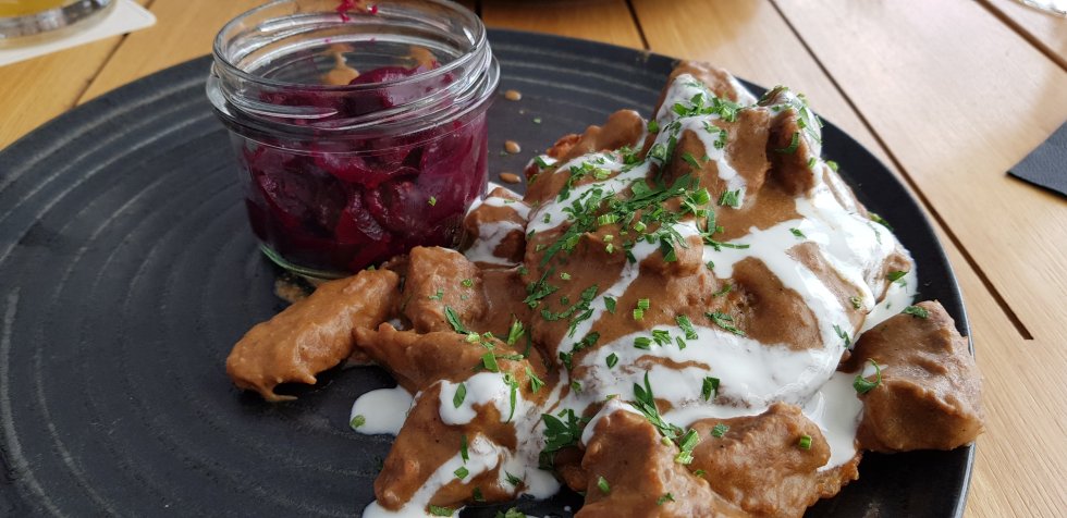 and I break my “entree only” rule for once, plumping for a goulash served with potato pancakes, and a side of beetroot.