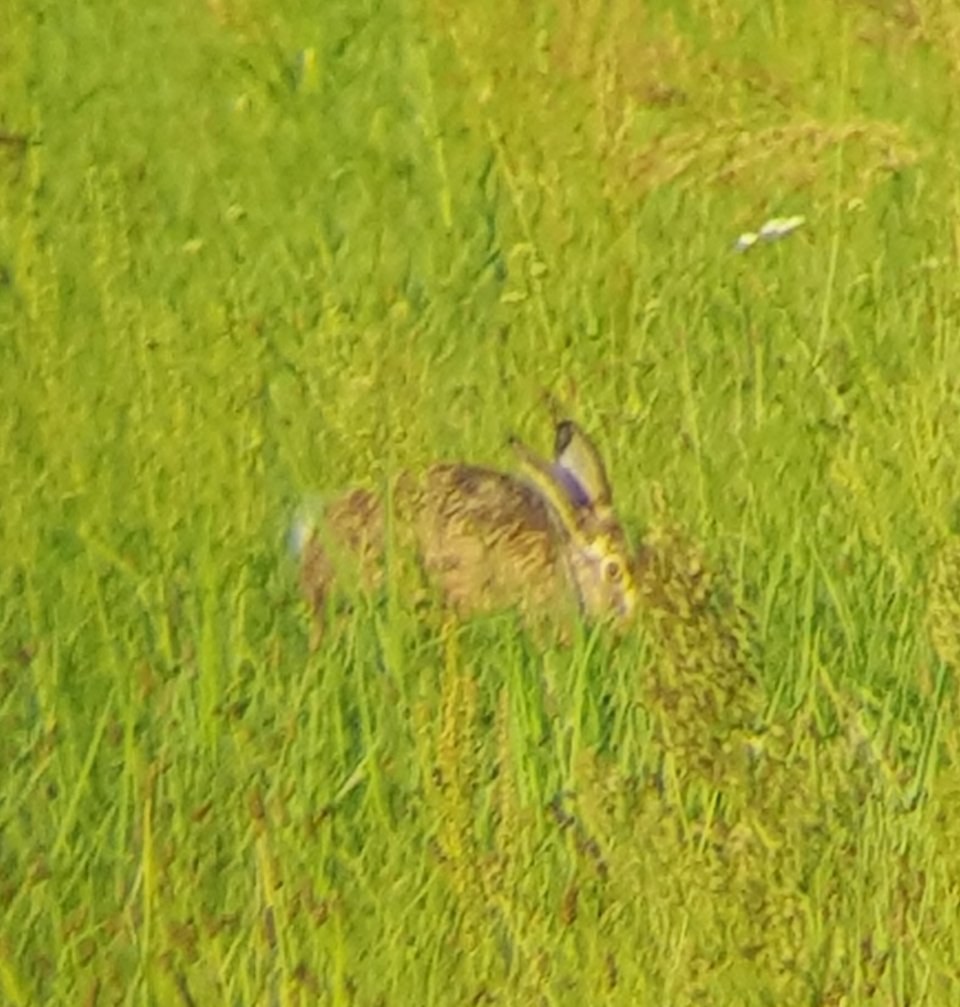 Early evening is spent in a joyous state, spying on a hare Himself spots in long grass behind us. Binoculars at the ready, I spend a happy couple of hours watching him go about the business of carefully selecting the choicest greens for his supper, as specific as a chef at market. He’s a very handsome fellow. In between the binoculars and my phone lined up with the lens, I manage this shot,