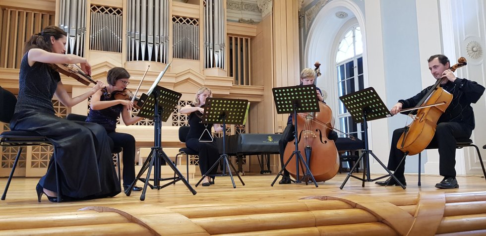 We’re seeing a string quintet, a chamber music ensemble featuring musicians from the Czech Philharmony and the Prague Symphony Orchestra, performing in the Lichtenstein Palace.