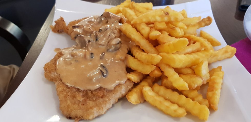 We stop for lunch (but secretly to find Black Forest cake) and get a little respite from the rain. We’re not far away from the Alsace region in France and its influence is seen in the menu, with my flammenkuchen.